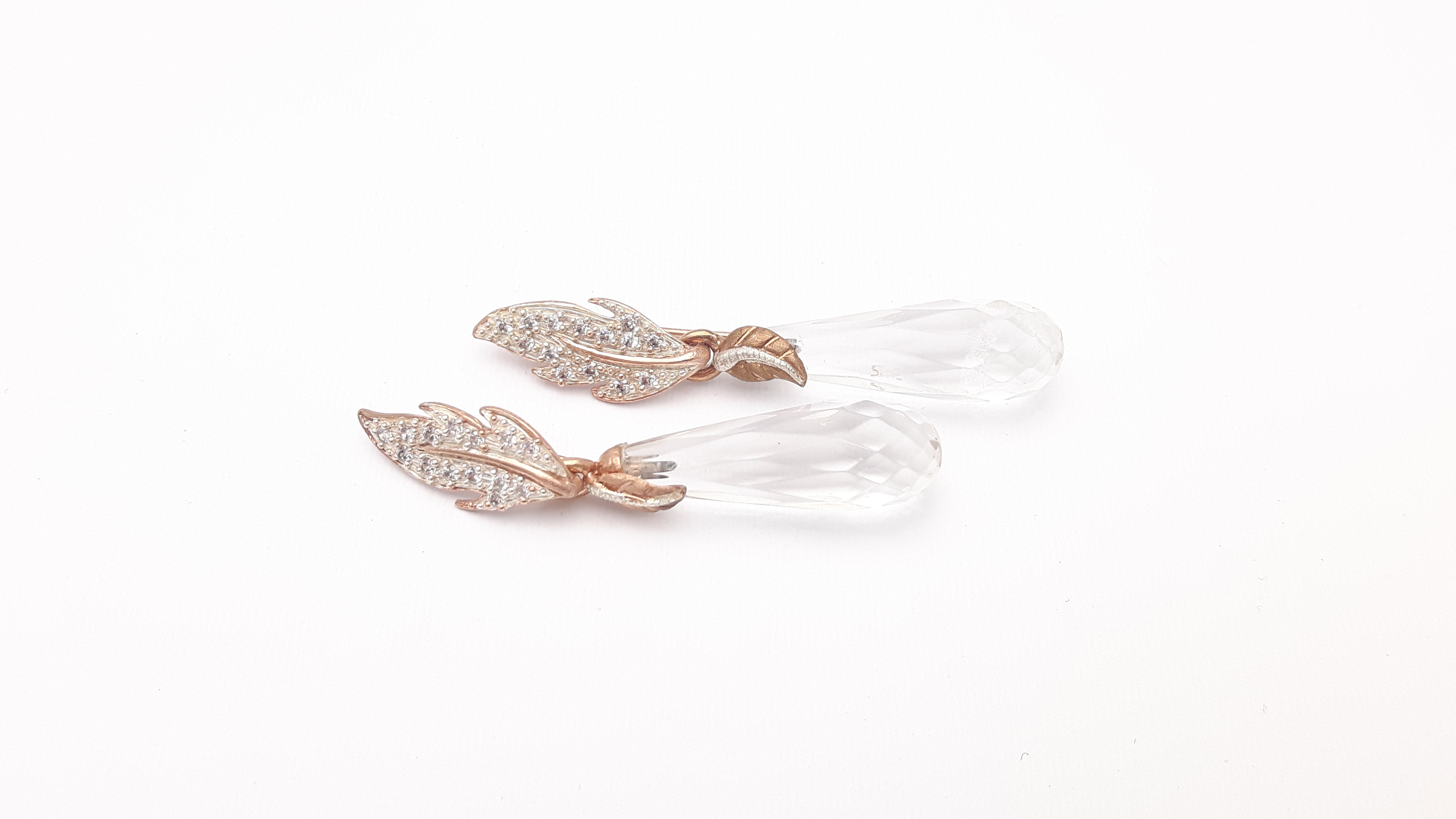 Orecchini “Eva” con gocce lunghe in cristallo di rocca. Realizzati in argento bagnato in oro rosa e zaffiri bianchi .