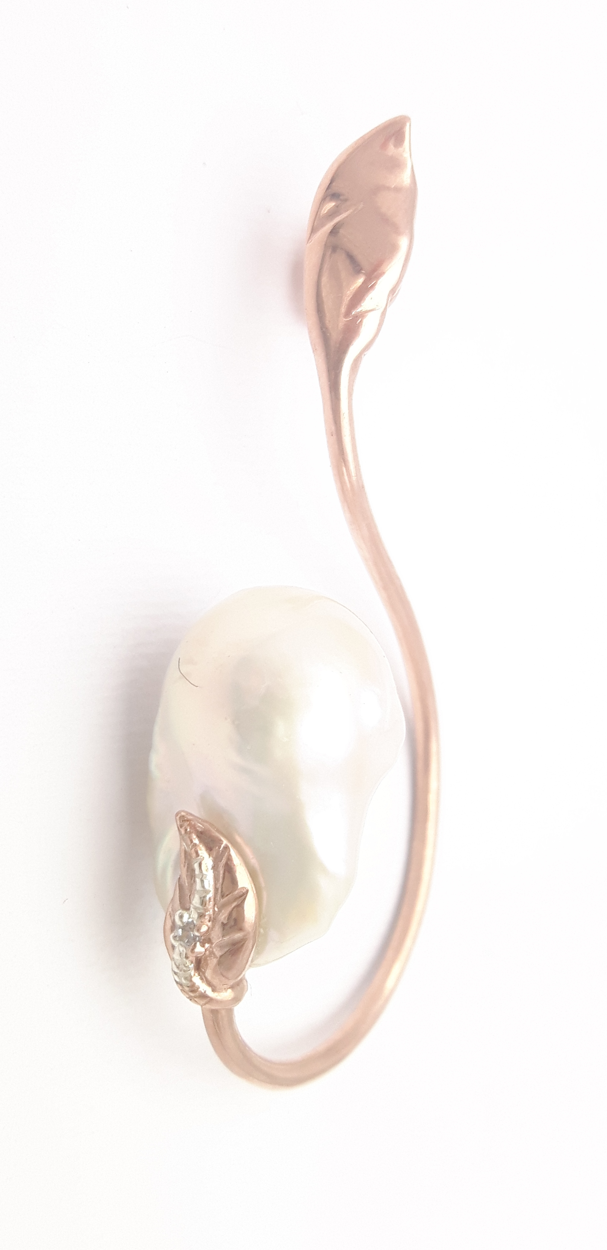 “Viburno Punto Interrogativo” earrings. Set in rosé gold plated sterling silver, white sapphires and baroque pearls.